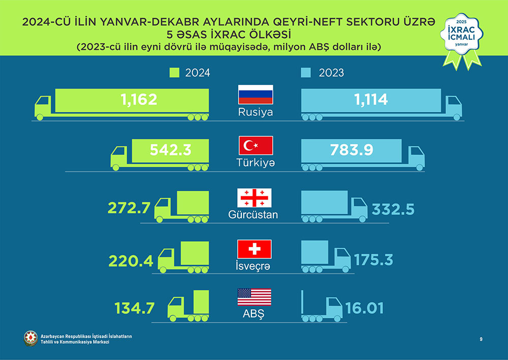 2024-cü ilin yanvar-dekabr ayları ərzində Rusiya Federasiyasına 1.2 milyard ABŞ dolları, Türkiyəyə 542,3 milyon ABŞ dolları, Gürcüstana 272,4 milyon ABŞ dolları, İsveçrəyə 220,4 milyon ABŞ dolları, ABŞ-a isə 134,7 milyon ABŞ dolları dəyərində qeyri-neft sektoruna aid mal ixrac olunub.
