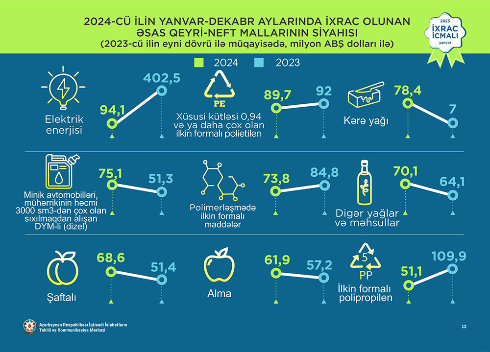 2024-cü ilin dekabr ayında ixrac edilmiş qeyri-neft sektoruna aid malların siyahısında xurma (27,1 milyon ABŞ dolları) birinci, tomat (pomidor) (20,1 milyon ABŞ dolları) ikinci, qızıl (19,5 milyon ABŞ dolları) üçüncü olub.
