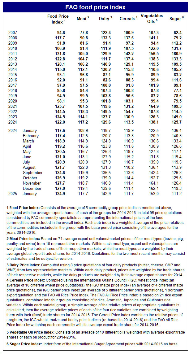 FAO Şəkər Qiyməti İndeksi də yanvar ayında aylıq 6,8 faiz, illik bazda isə 18,5 faiz azalaraq 2022-ci ilin oktyabrından bəri ən aşağı səviyyəyə düşüb. Yanvar ayındaki azalma, son aylarda Braziliyada ümumilikdə əlverişli hava şəraitinin 2025-ci ilin aprelindən yığılacaq şəkər qamışı məhsuluna fayda verməsindən sonra davam edən 2024/25 mövsümü üçün qlobal tədarük gözləntilərinin yaxşılaşması ilə əlaqədardır. Bundan əlavə, Hindistan hökumətinin 2023-cü ilin oktyabr ayından məhdudlaşdırılmış şəkər ixracını bərpa etmək qərarı dünya şəkər qiymətlərinə daha da aşağı təzyiq göstərib.