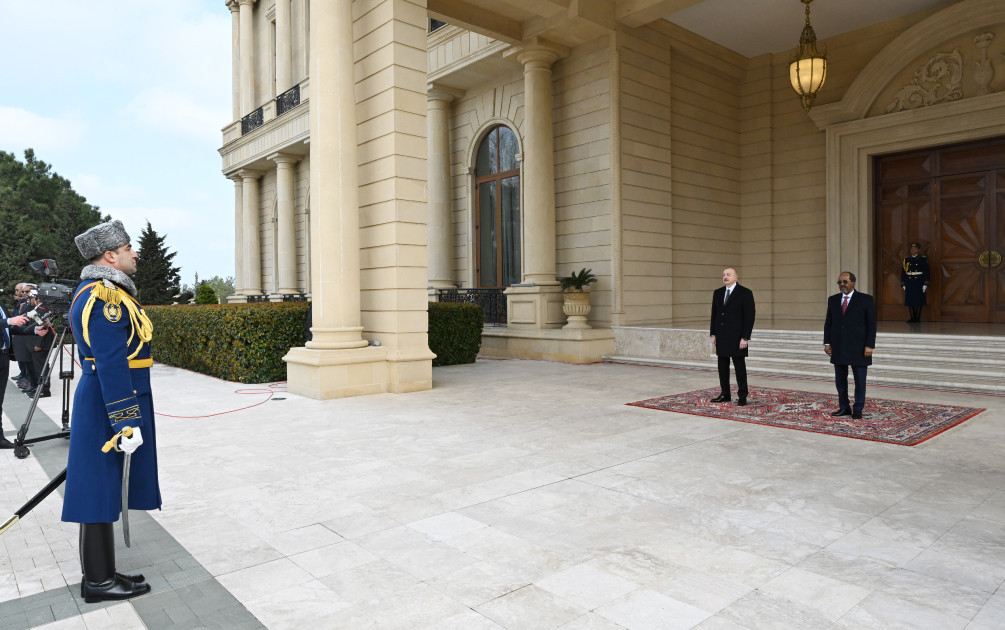 Hər iki ölkənin Dövlət bayraqlarının dalğalandığı meydanda Somali Prezidentinin şərəfinə fəxri qarovul dəstəsi düzülüb.