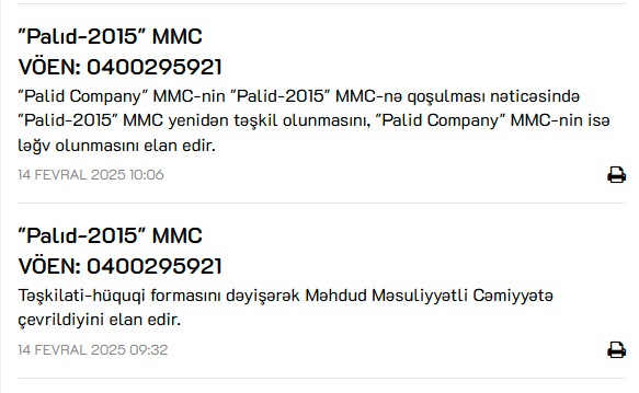 Marja.az xəbər verir ki, "Palıd-2015" MMC, qoşulması nəticəsində şirkətin yenidən təşkil olunmasını, "Palid Company" MMC-nin isə ləğv olunmasını elan edib.