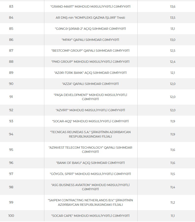 2024-cü ildə ən çox vergi ödəyən və bu barədə məlumatın açıqlanmasına razılıq verən 100 vergi ödəyicisi (büdcə təşkilatları istisna olmaqla)