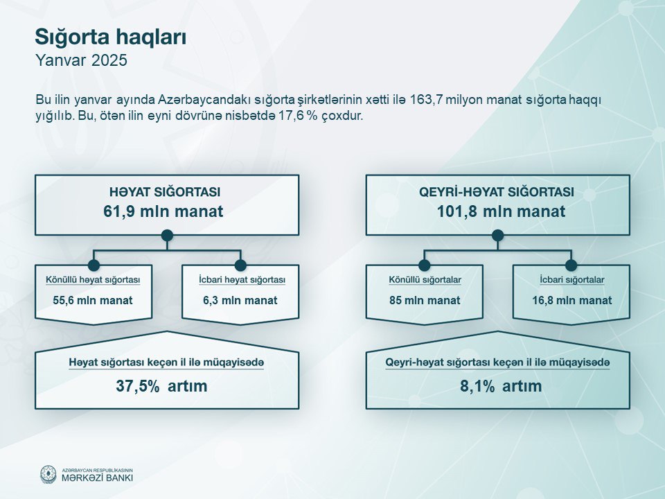 2025-ci ilin Yanvar ayında Azərbaycandakı sığorta şirkətləri tərəfindən 163,7 milyon manat sığorta haqları yığılıb.