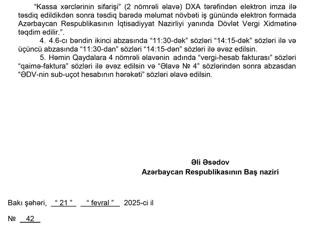 Nazirlər Kabineti 30 dekabr 2007-ci il tarixli qərarı ilə təsdiq edilmiş “Vergi ödəyicisinə verilmiş elektron qaimə-faktura üzrə alınmış malların (iş və xidmətlərin) dəyəri ödənilərkən ƏDV-nin ödənilməsi, ƏDV-nin depozit hesabında uçotun aparılması, ƏDV-nin hərəkəti, bu hesab üzrə aparılan əməliyyatlardan ƏDV-nin əvəzləşdirilməsi və dövlət büdcəsinə köçürülməsi Qaydaları”nda dəyişiklik edib.