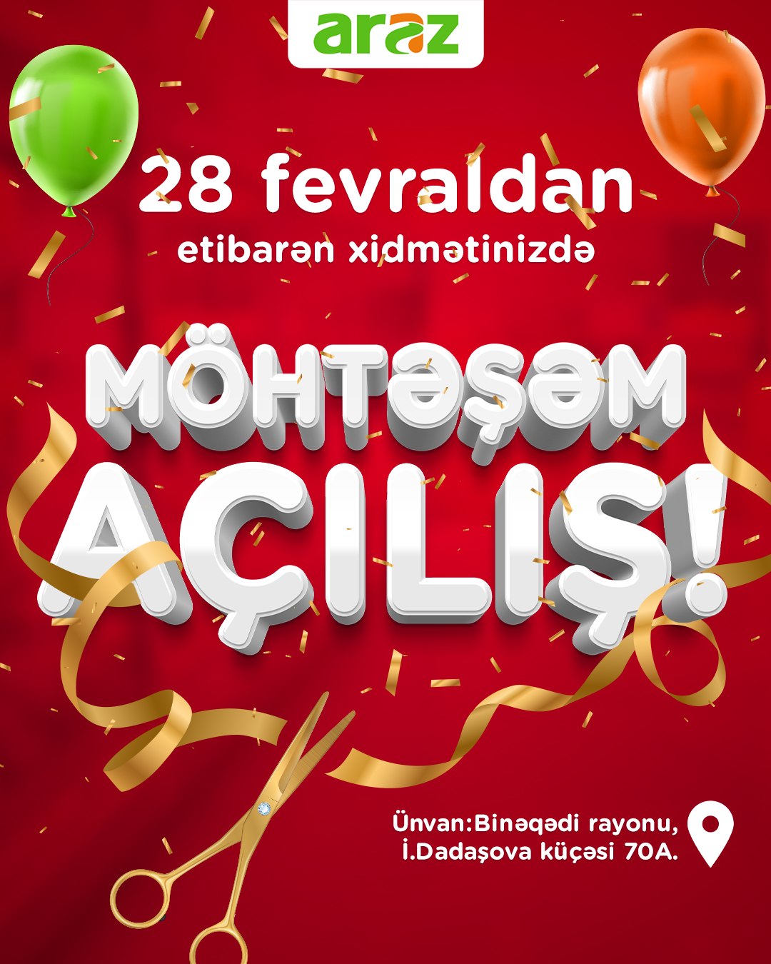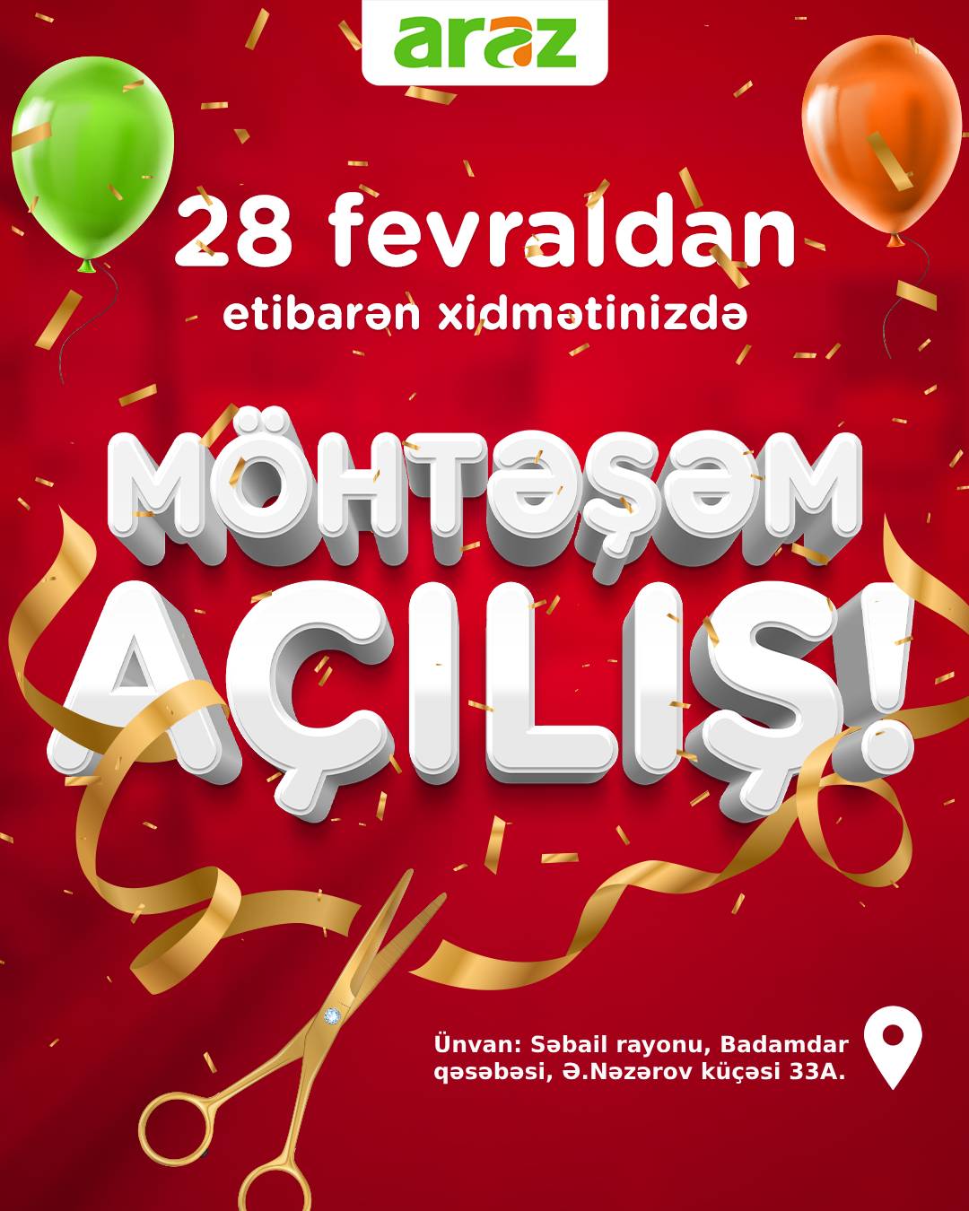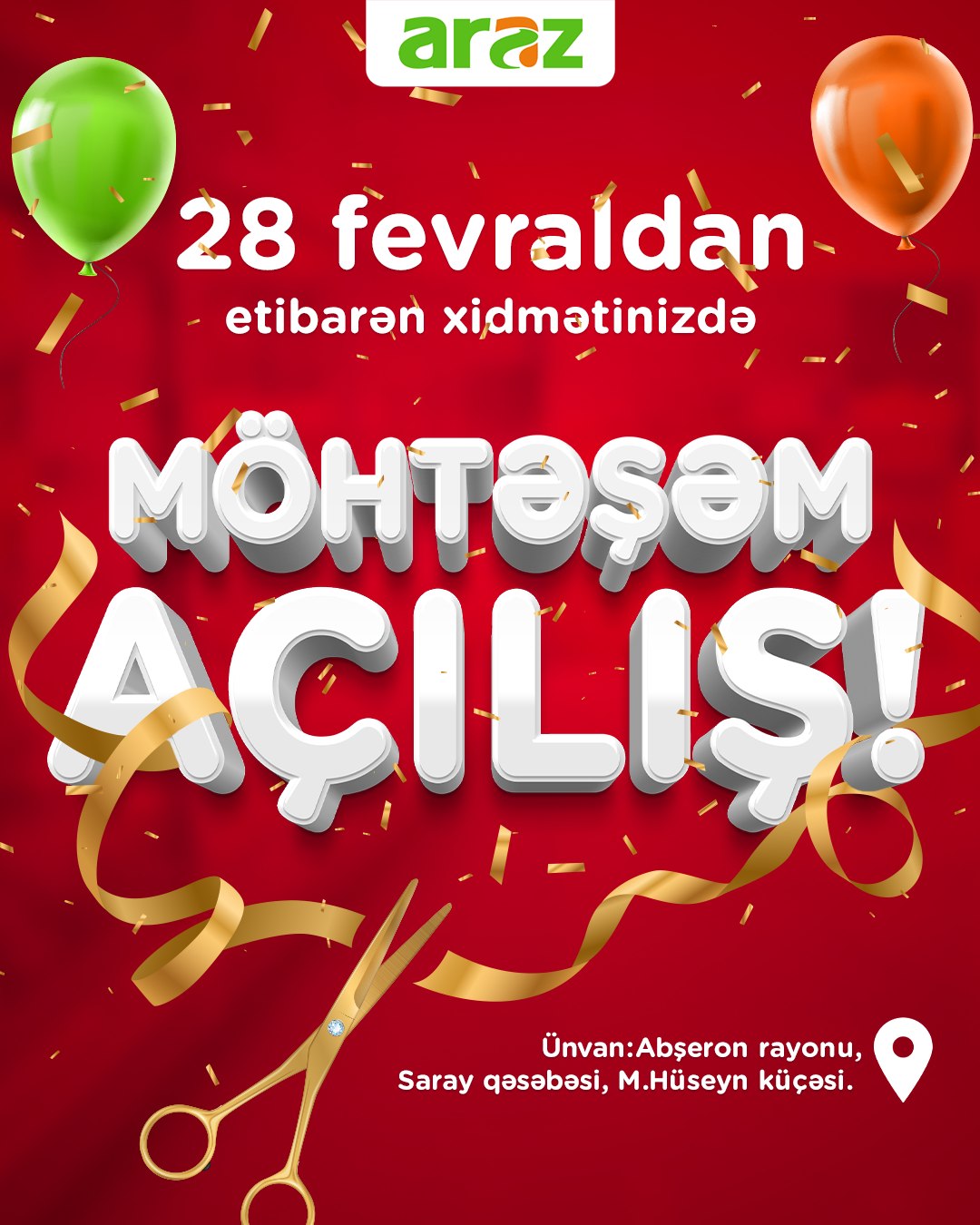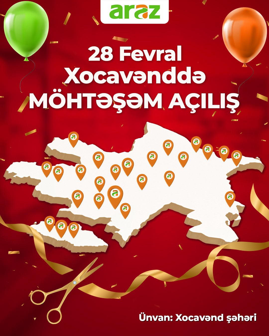 Marja.az şəbəkəyə istinadən xəbər verir ki, “Araz”ın Xocavənd, Saray Superstore, Azadlıq Superstore, Yasamal Supermarket, Badamdar Supermarket filialları 28 fevral 2025-ci il tarixindən etibarən xidmət göstərməyə başlayacaq.