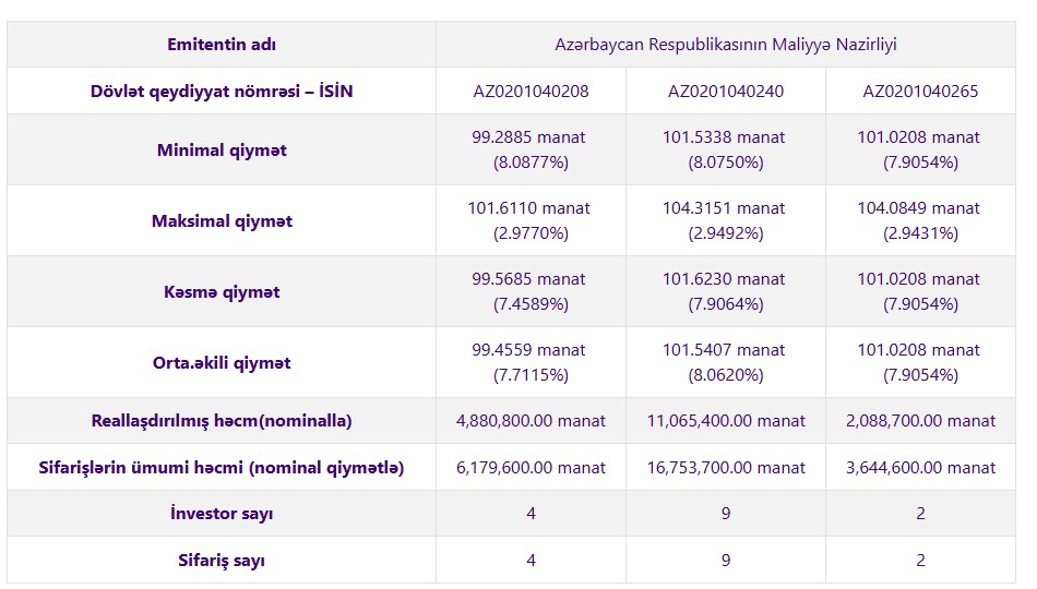 Birjanın yaydığı məlumata görə, aşağıda qeyd olunmuş siyahıda göstərilən İSİN kodlu istiqrazların qanunvericiliyə və buraxılış şərtlərinə müvafiq olaraq hərrac üsulu ilə geri çağırılması həyata keçirilmişdir.
