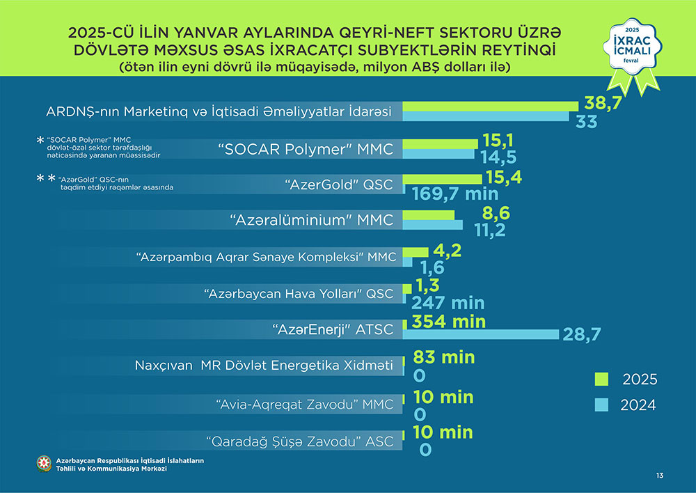 Marja.az xəbər verir ki, 2025-ci ilin yanvar ayında hazırlanmış qeyri-dövlət ixracatçı subyektlərin reytinqində ilk onluqda aşağıdakı şirkətlər təmsil olunublar: