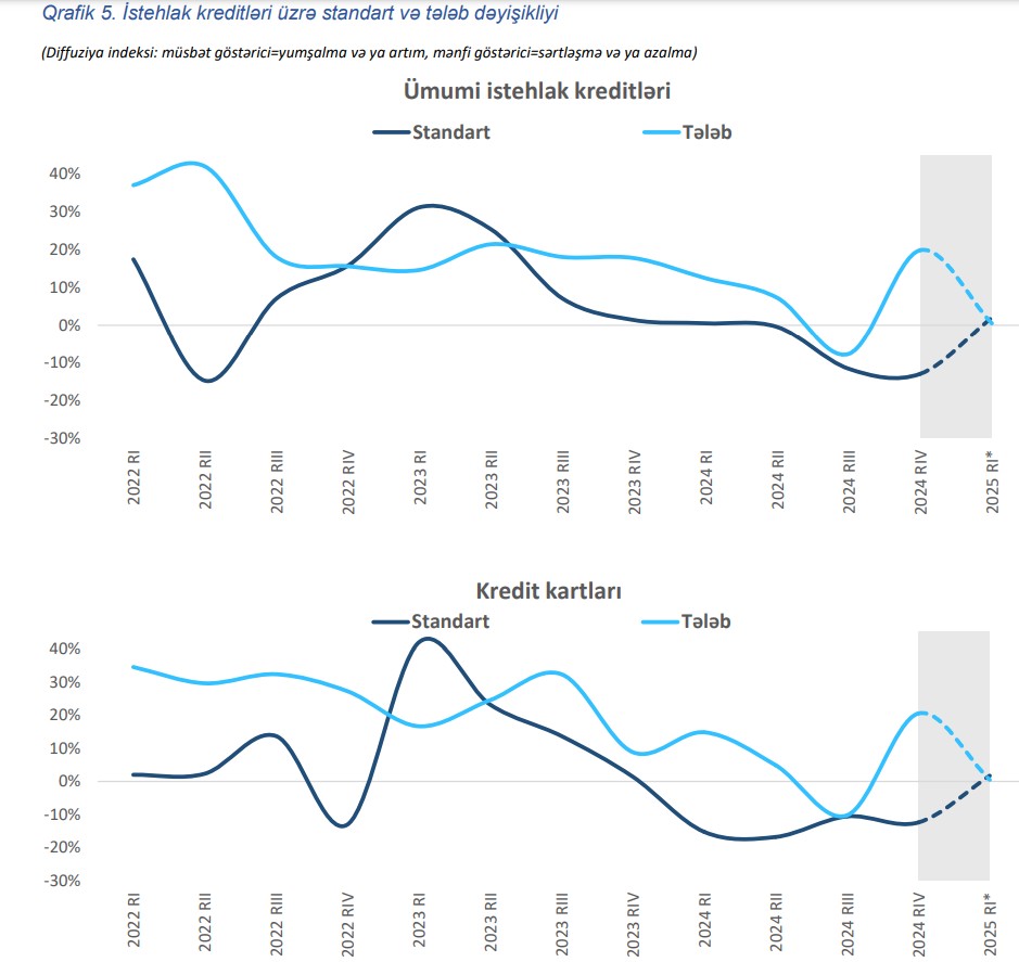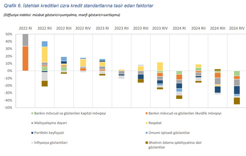 Sorğu nəticələrinə əsasən, istehlak kreditləri üzrə portfelin keyfiyyəti, kapital mövqeyi, maliyyələşmə dəyəri və əhalinin ödəmə qabiliyyətinə dair gözləntilər kredit standartlarına sərtləşdirici təsir göstərib.