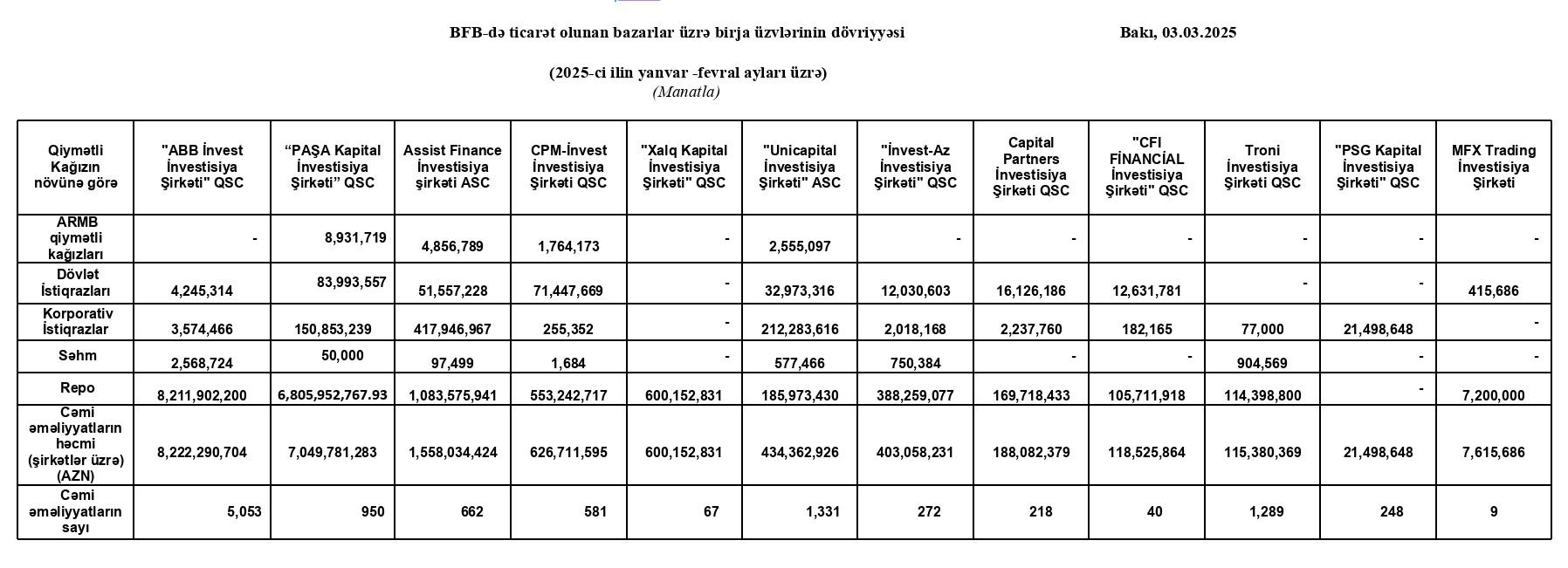 Marja.az Birjaya istinadən xəbər verir ki, "ABB İnvest İnvestisiya Şirkəti" QSC 8 milyard 222 milyon 291 min manat dövriyyə ilə 1-ci, “PAŞA Kapital İnvestisiya Şirkəti” QSC 7 milyard 49 milyon 781 min manat dövriyyə ilə 2-ci, "Assist Finance İnvestisiya Şirkəti" ASC 1 milyard 558 milyon 34 min manat dövriyyə ilə 3-cü olub.