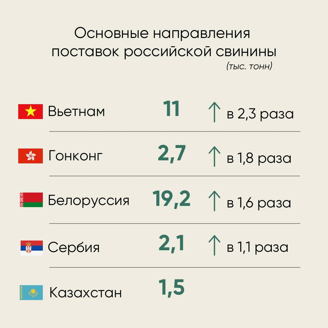 Rusiyadan donuz əti ixracının həcmi iki dəfə artaraq 44,4 min ton təşkil edib. Fevralın 28-nə olan məlumatlara görə, donuz əti ixracı ən çox Vyetnama olub - 2,3 dəfə artıb və 11 min ton təşkil edib. Honq-Konqa (2,7 min ton), Belarusa (19,2 min ton), Serbiyaya (2,1 min ton) və Qazaxıstana (1,5 min ton) icarcın həcmi də artıb.