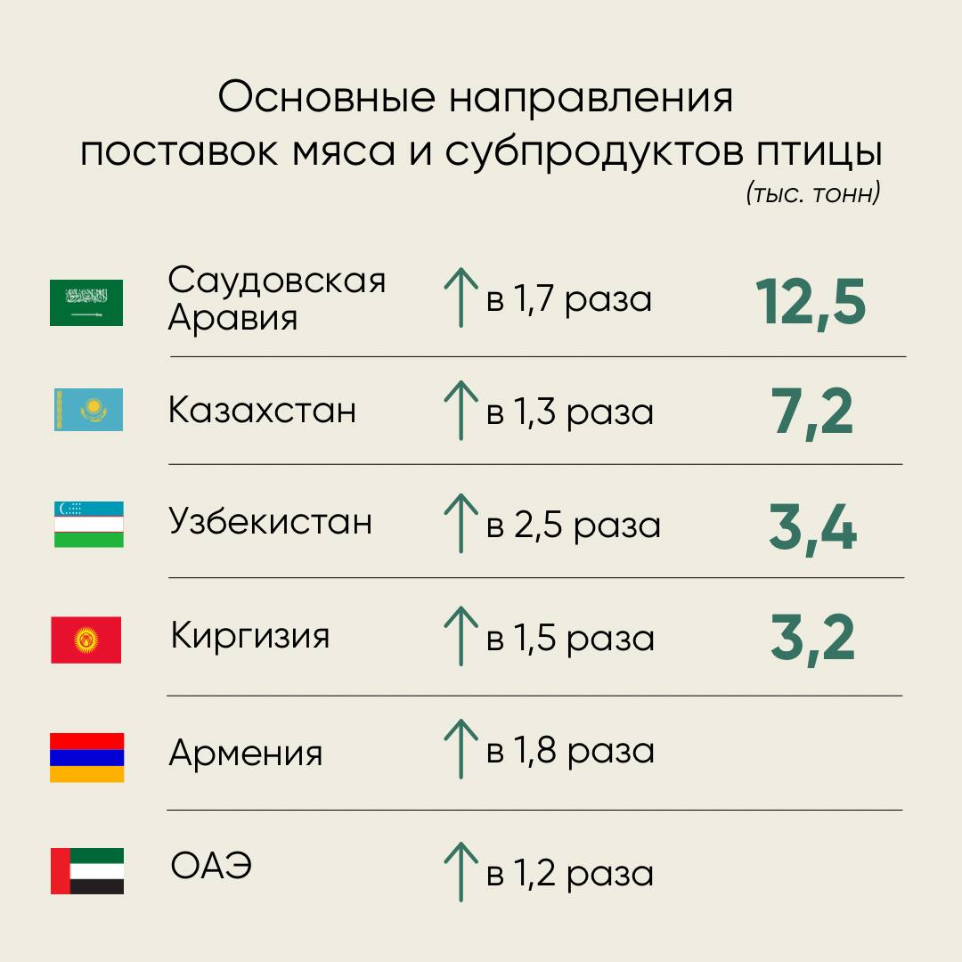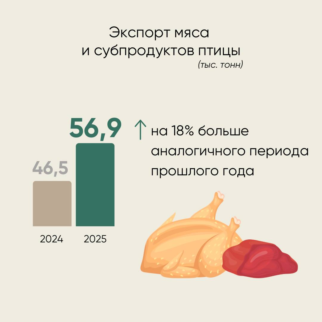Rusiyanın quş əti ixracı isə 18% artaraq 56,9 min tona çatıb. Əsas çatdırılma istiqamətləri Səudiyyə Ərəbistanı, Qazaxıstan, Özbəkistan, Qırğızıstan, Ermənistan və BƏƏ olub.