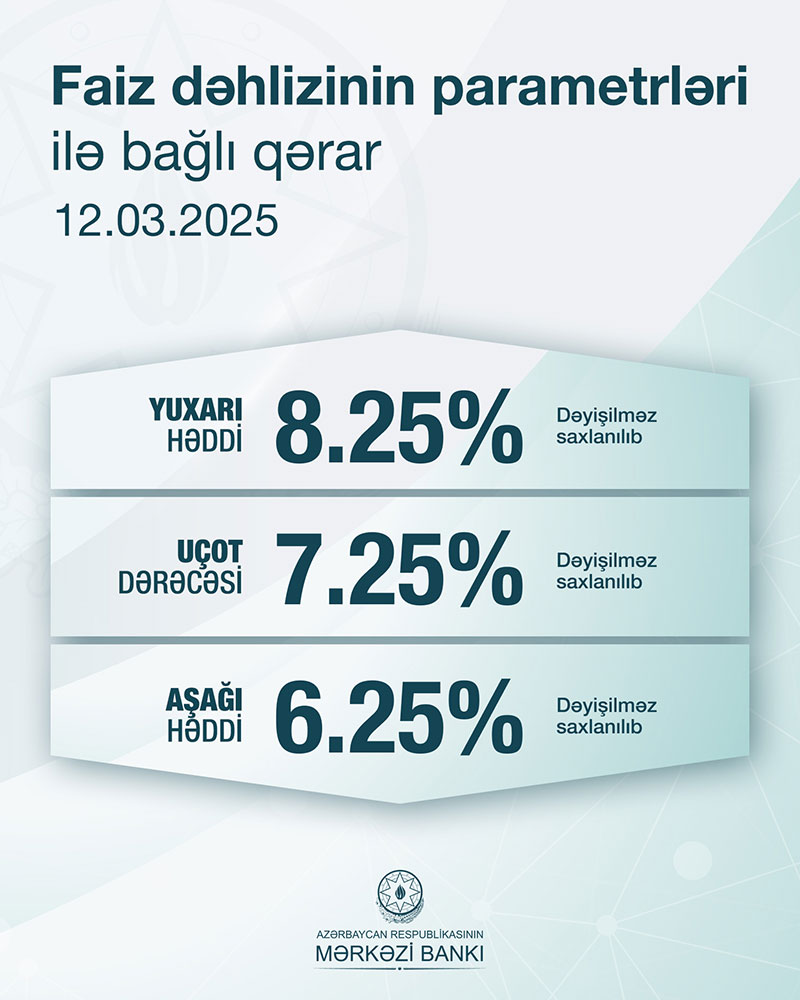 Azərbaycan Respublikası Mərkəzi Bankının İdarə Heyətinin qərarı ilə uçot dərəcəsi 7.25%, faiz dəhlizinin aşağı həddi 6.25%, faiz dəhlizinin yuxarı həddi isə 8.25% səviyyəsində dəyişməz saxlanılıb.