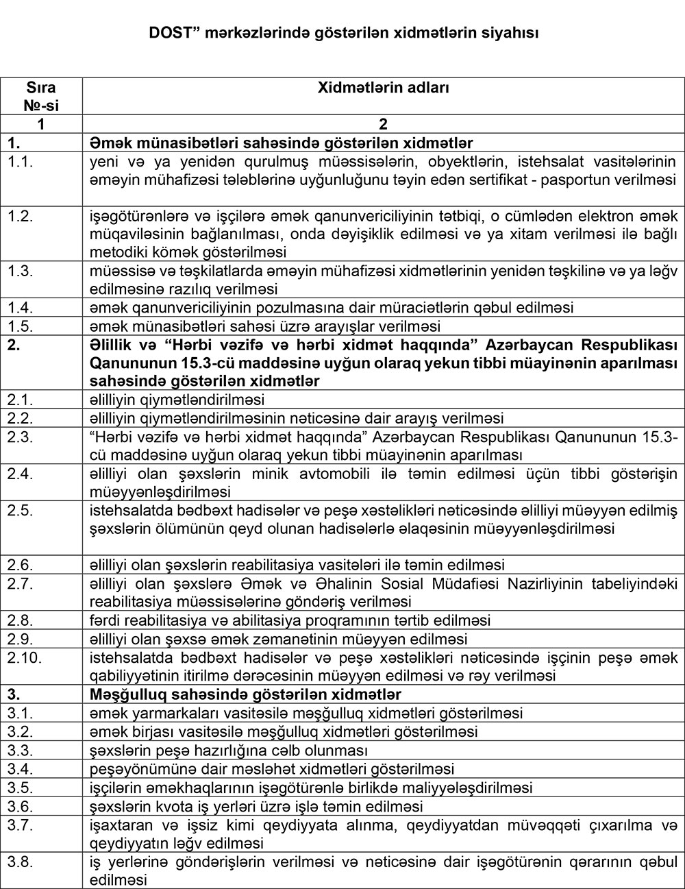 "DOST” mərkəzlərində göstərilən xidmətlərin siyahısı təsdiqlənib.