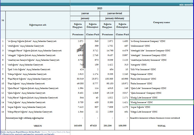2025-ci ilin ilk 2 ayı ərzində (yanvar-fevral) Azərbaycanda fəaliyyət göstərərn 16 sığorta şirkəti vasitəsilə 281 milyon 206 min manat sığorta haqları hesablanıb.