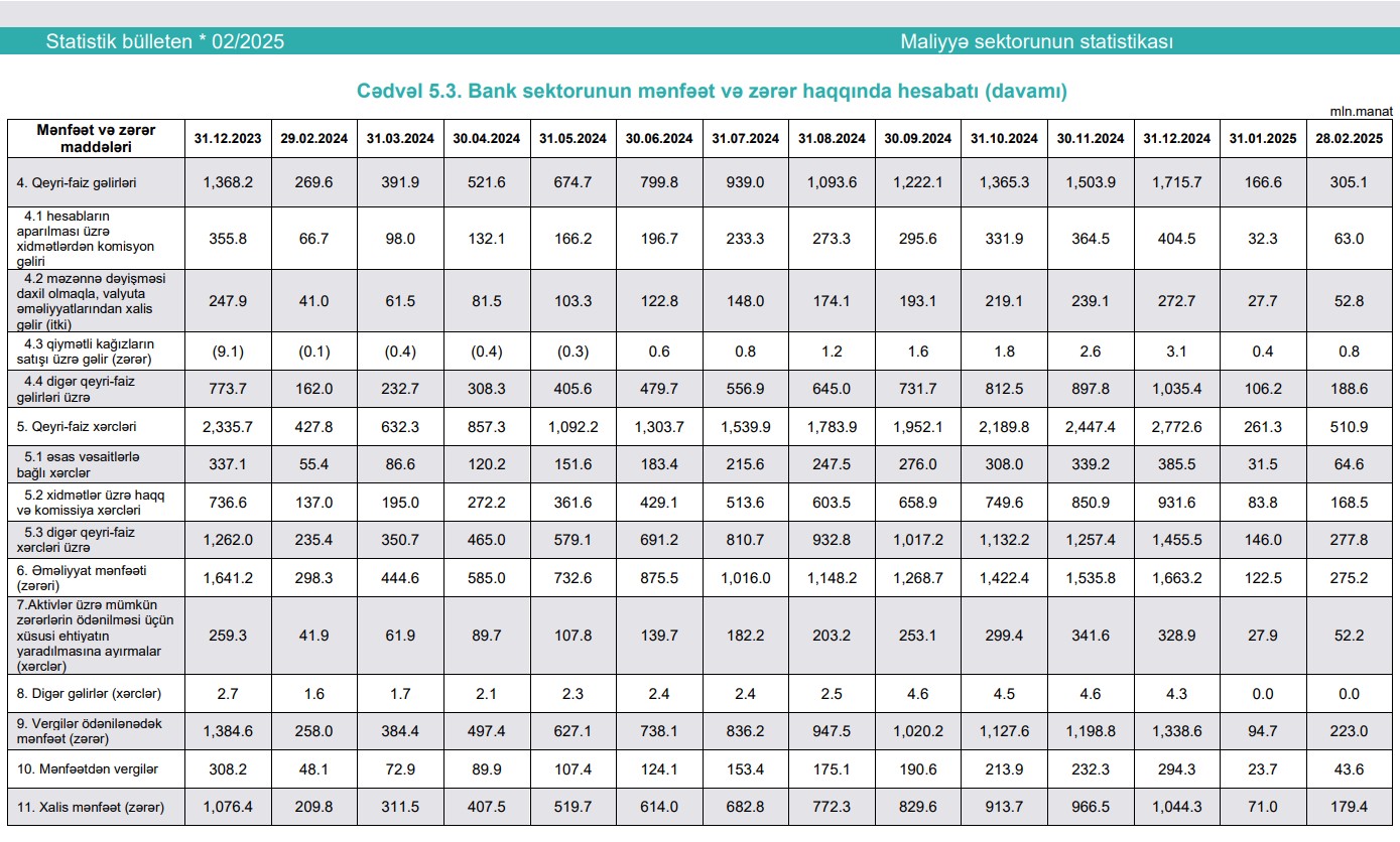 2025-ci ilin yanvar- fevral aylarında banklar 179.4 milyon manat xalis mənfəət, 275.2 milyon manat məbləğində əməliyyat mənfəəti əldə ediblər.