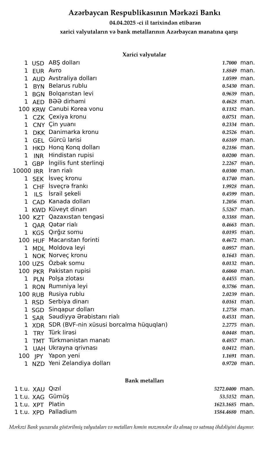 Dolların bazar ertəsi üçün rəsmi məzənnəsi müəyyən olunub