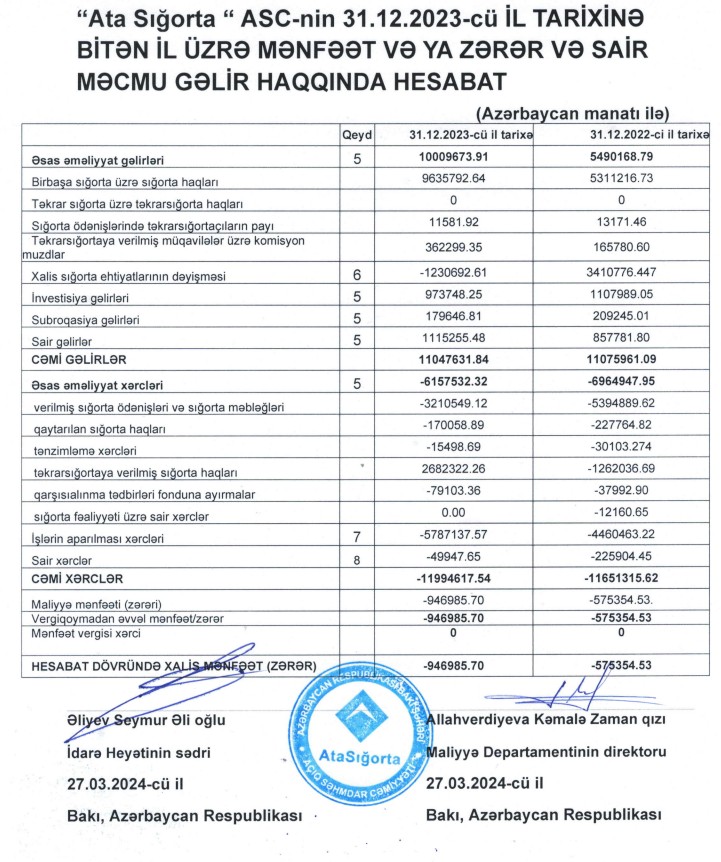 Qeyd edək ki, "AtaSığorta" 2021-ci ili 2 milyon 265 min manat, 2022-ci ili 575 min manat, xalis zərər ilə başa vurmuşdur. Şirkət sonuncu dəfə 2020-ci ildə xalis mənfəət əldə edib. Həmin il "AtaSığorta"nın xalis mənfəəti 714 min manat olmuşdu.