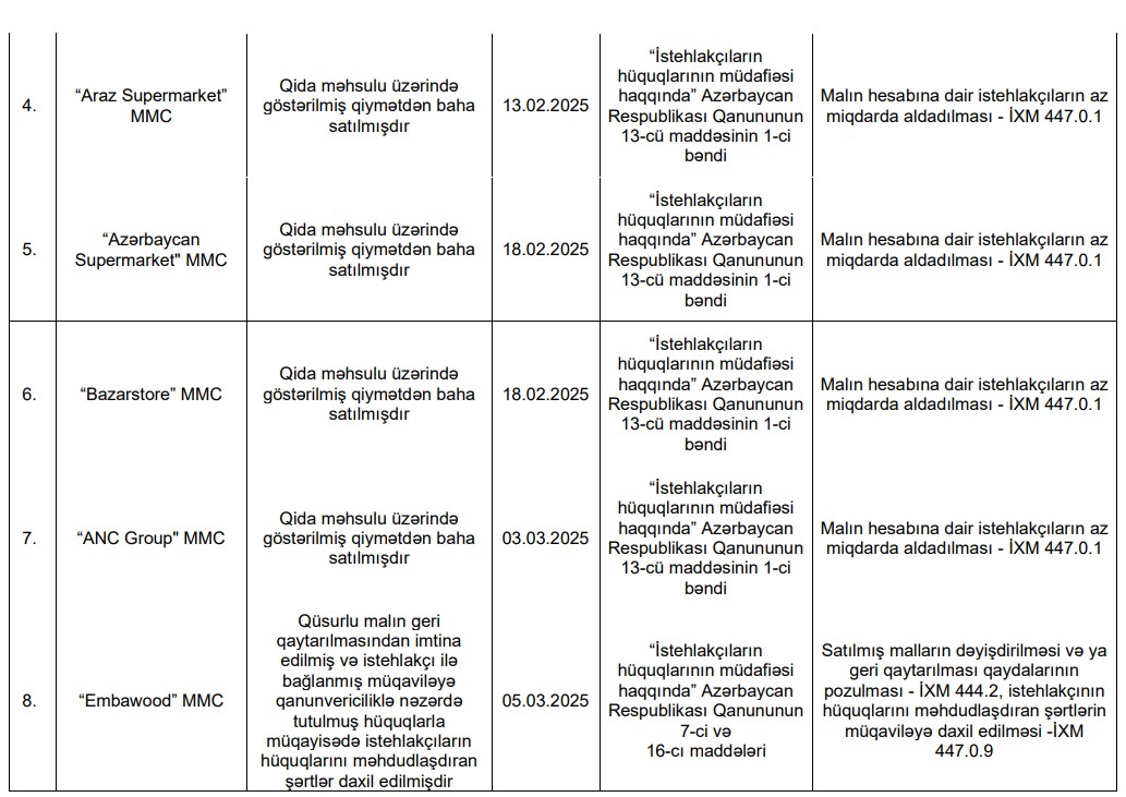 Belə ki, fiziki şəxs İbrahimova Vüsalə Vaqif qızı, “Azerbaijan Technologies” Firması, F/ş Əfəndiyev Əmrah Camaldin oğlu, Araz Supermarket” MMC, “Azərbaycan Supermarket" MMC (Bravo brendi), “Bazarstore” MMC, “ANC Group" MMC (Rahat Market), “Embawood” MMC, "Grand-Mart" MMC, fiziki şəxs Əli-zadə Gündüz Vüqar oğlu və "Zeytun Pharmaceuticals" MMC barəsində inzibati xəta haqqında protokol tərtib edilib.