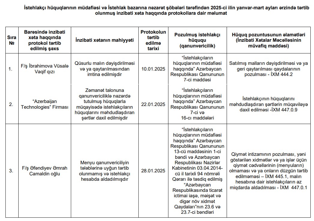 İstehlakçı hüquqlarının müdafiəsi və İstehlak bazarına nəzarət şöbələri tərəfindən 2025-ci ilin yanvar-mart ayları ərzində tərtib olunmuş inzibati xəta haqqında protokollara dair məlumat