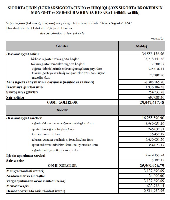 "Meqa Sığorta"nın cəmi xərcləri isə 2023-cü ildə 25 milyon 910 min manat ikən, 2024-cü ildə 33 milyon 47 min manat təşkil edib (7 milyon 137 min manat və ya 27,5% artıb).