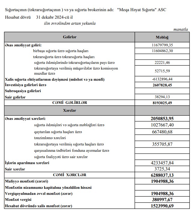 "Meqa Həyat Sığorta" ASC 2024-cü ili 1 milyon 524 min manat xalis mənfəət ilə başa vurub. Şirkət 2023-cü ili 1 milyon 86 min manat xalis mənfəət ilə bağlamışdı. Beləliklə, "Meqa Həyat Sığorta"nın xalis mənfəəti 2024-cü ildə 2023-cü illə müqayisədə 438 min manat və ya 40,3% artıb.