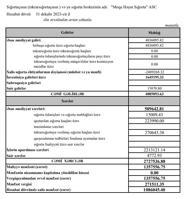 Marja.az Şirkətin maliyyə hesabatlarına istinadən xəbər verir ki, "Meqa Həyat Sığorta"nın cəmi gəlirləri 2023-cü ildə 4 milyon 85 min manat ikən, 2024-cü ildə 8 milyon 193 min manat təşkil edib (4 milyon 107 min manat və ya 2 dəfə artıb).