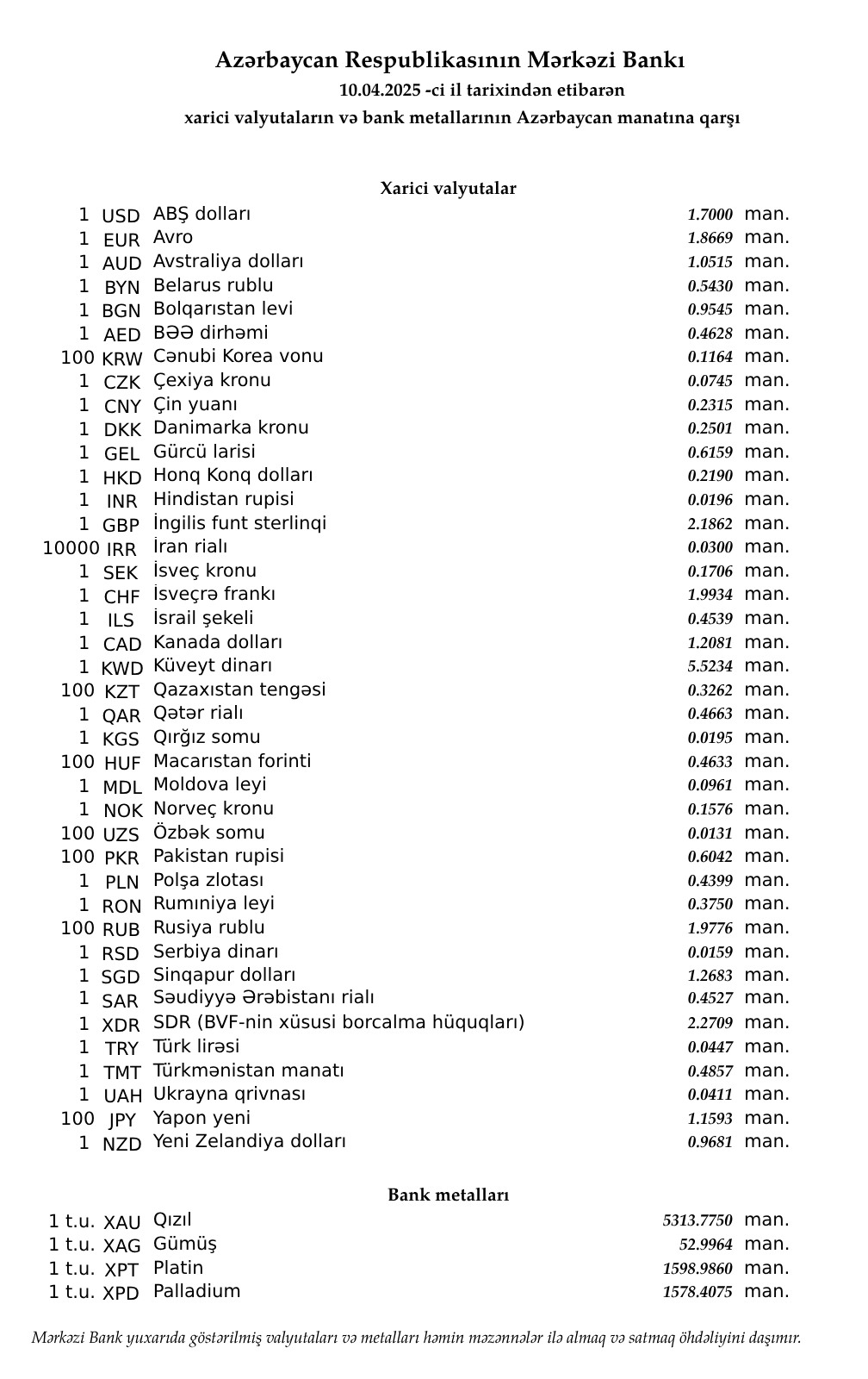 Dolların bazar ertəsi üçün rəsmi məzənnəsi müəyyən olunub