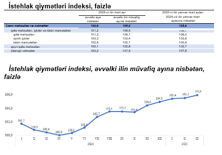 Məlumata görə, 2025-ci ilin mart ayında istehlak qiymətləri indeksi (inflyasiya göstəricisi) 2024-cü ilin mart ayına nisbətən 5,9 faiz, o cümlədən qida məhsulları, içkilər və tütün məmulatları üzrə 6,5 faiz, qeyri-qida məhsulları üzrə 2,8 faiz, əhaliyə göstərilmiş ödənişli xidmətlər üzrə 7,5 faiz artıb. 2025-ci ilin mart ayında istehlak qiymətləri indeksi əvvəlki aya nisbətən 0,6 faiz, yanvar-mart aylarında isə əvvəlki ilin müvafiq dövrünə nisbətən 5,6 faiz yüksəlib.