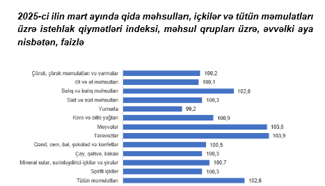 2025-ci ilin mart ayında qida məhsulları, içkilər və tütün məmulatları üzrə istehlak qiymətləri indeksi əvvəlki aya nisbətən 1,2 faiz, yanvar-mart aylarında isə əvvəlki ilin müvafiq dövrünə nisbətən 5,7 faiz qalxıb.