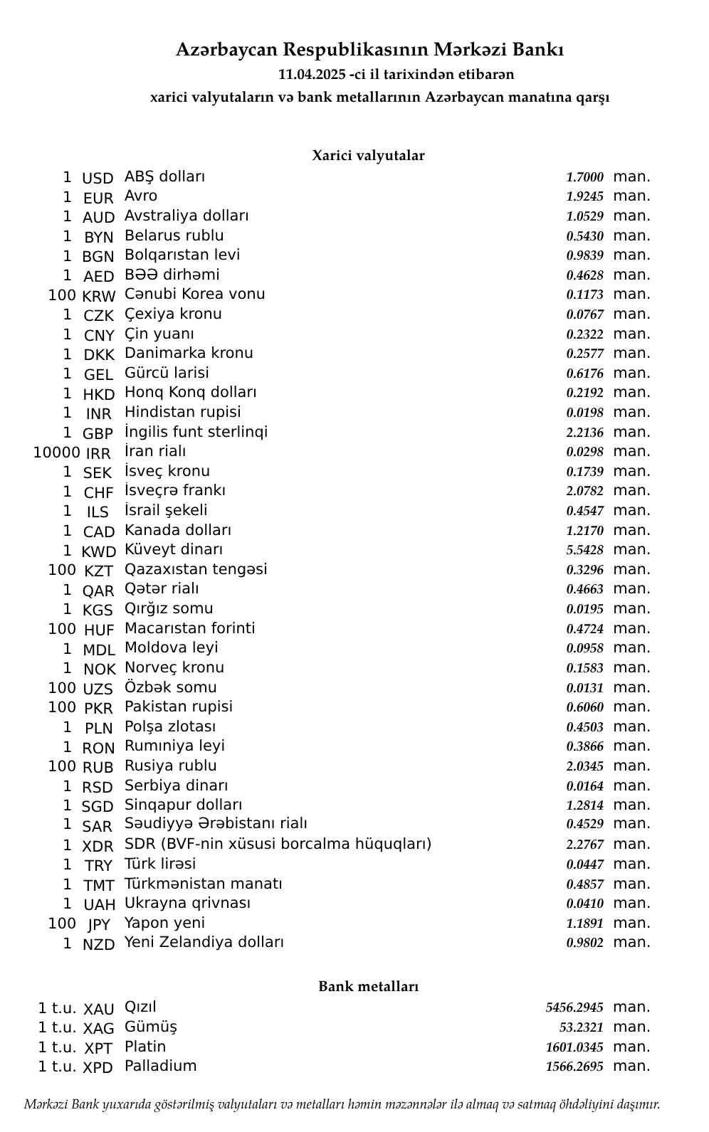 Dolların bazar ertəsi üçün rəsmi məzənnəsi müəyyən olunub