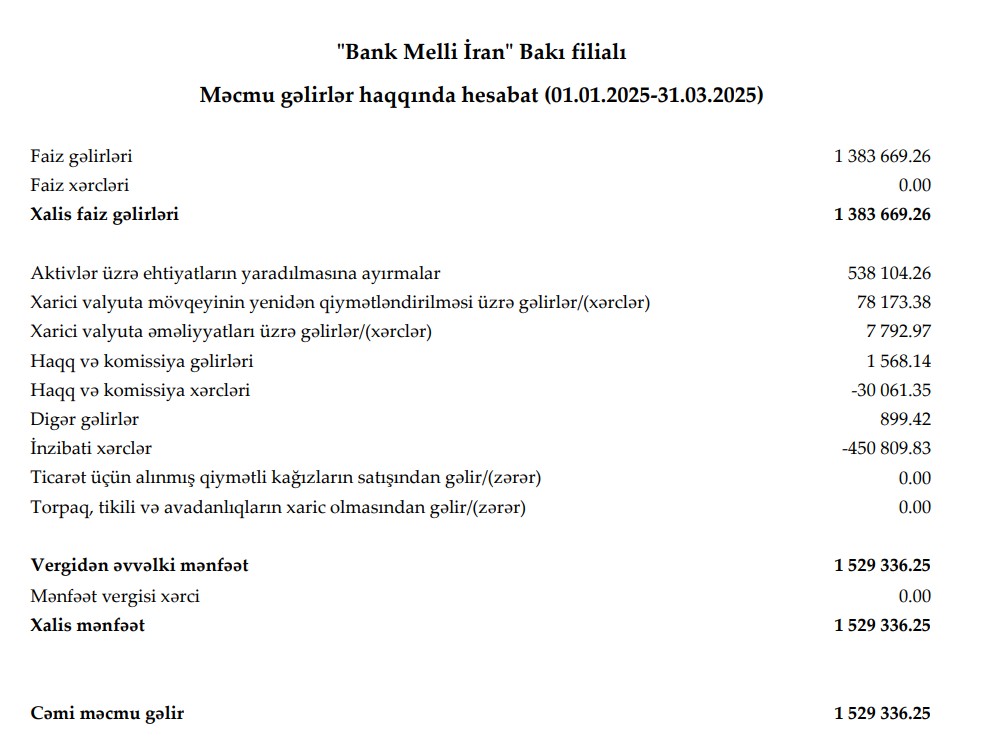 "Bank Melli İran" Bakı filialı 2025-ci ilin 1-ci rübünü (yanvar-mart) 1 milyon 529 min manat xalis mənfəət ilə başa vurub. Filial 2024-cü ilin eyni dövrünü 2 milyon 490 min manat xalis mənfəət ilə bağlamışdı. Beləliklə, "Bank Melli İran" Bakı filialının xalis mənfəəti 2025-ci ilin birinci rübündə ötən ilin eyni dövrü ilə müqayisədə 961 min manat və ya 38,6% azalıb.