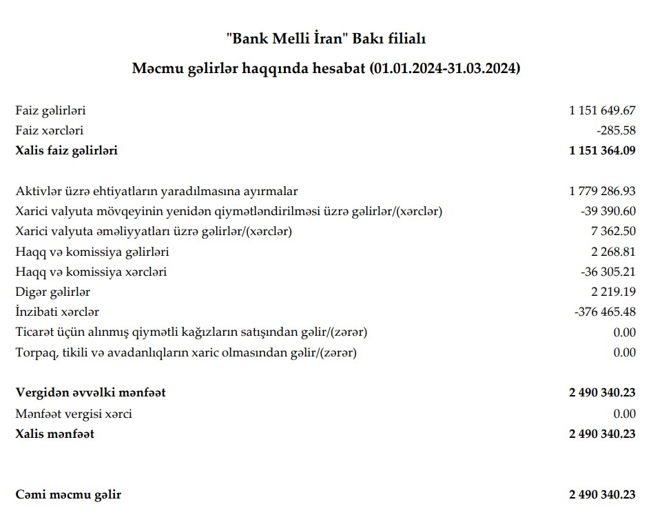 Xatırladaq ki, 2024-cü ilin 1-ci rübündə "Bank Melli İran" Bakı filialının cəmi əməliyyat gəlirlər 2 milyon 943 min manat, cəmi əməliyyat xərcləri 452 min manat təşkil etmişdi.