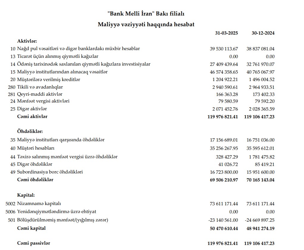 "Bank Melli İran" Bakı filialının cəmi aktivləri 2024-cü ilin sonu ilə müqayisədə ilk rübdə 870 min manat artaraq 31 Mart 2025-ci il tarixində 119 milyon 977 min manata çatıb. Filialın maliyyə institutlarından alınacaq vəsaitləri 14,2% artaraq 46 milyon 574 min manata yüksəlib. 31 Mart 2025-ci il tarixində "Bank Melli İran" Bakı filialı 1 milyon 205 min manat kredit portfelinə (müştərilərə verilmiş kreditlər) malik olub. Eyni tarixə, Filialın qiymətli kağızlara investisiyaları isə 27 milyon 409 min manat təşkil edib.