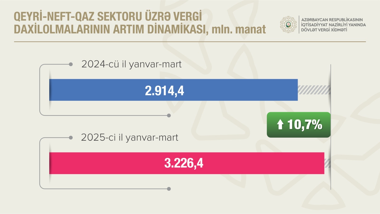Qeyri-neft-qaz sektorundan daxilolmalar 3 milyard 226,4 milyon manatdan çox təşkil edib. 2024-cü ilin müvafiq dövrünə nisbətən bu sektordan vergi daxilolmaları 312 milyon manat və ya 10,7 faiz çox olub.