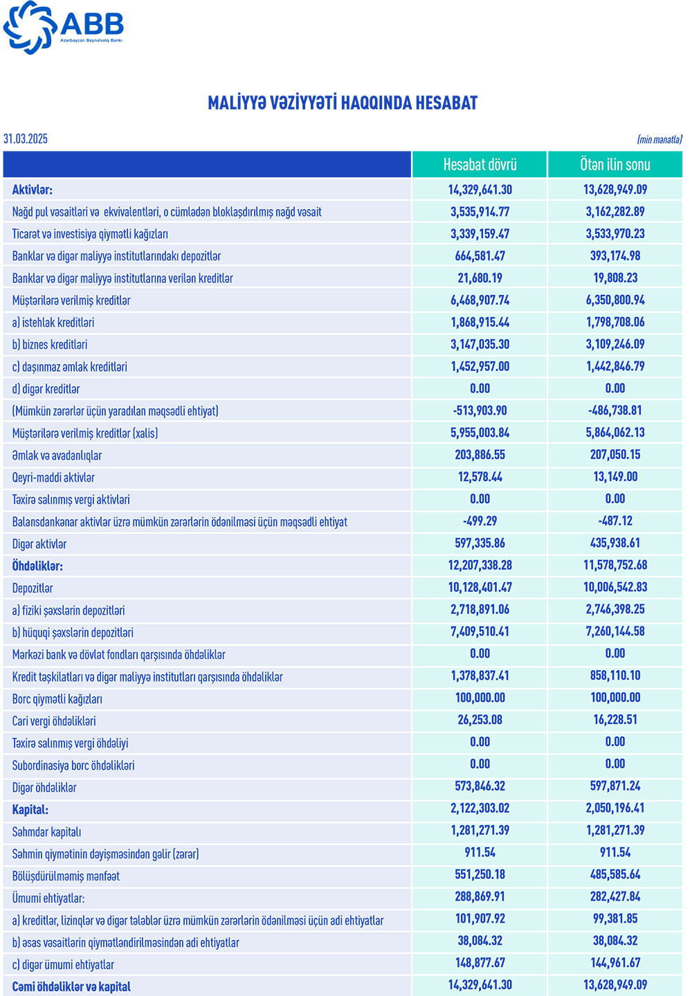 "ABB"nin cəmi aktivləri 2024-cü ilin sonu ilə müqayisədə ilk rübdə 700 milyon 692 min manat və ya 5,1% artaraq 31 mart 2025-ci il tarixində 14 milyard 329 milyon 641 min manata çatıb. O cümlədən, Bankın kredit portfeli (müştərilərə verilmiş kreditlər) 118 milyon 107 min manat və ya 1,8% artaraq 6 milyard 468 milyon 908 min manata yüksəlib.