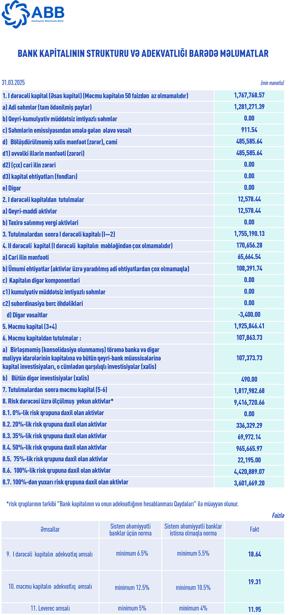 31 Mart 2025-ci il tarixində "ABB" ASC 1 milyard 817 milyon 982 min manat məcmu kapitala malik olub (31 dekabr 2024-cü il tarixində1 milyard 743 milyon 760 min manat təşkil etmişdi). Bankın I dərəcəli kapitalının adekvatlıq əmsalı 18,64% (norma minimum 6%), məcmu kapitalının adekvatlıq əmsalı 19,31% (norma minimum 12%), Leverec əmsalı 11,95% (norma minimum 5%) təşkil edib.