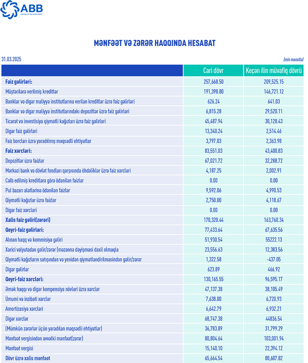 "ABB" 2025-ci ilin ilk rübünün əməliyyat mənfəətindən 36 milyon 784 min manat mümkün zərərlər üçün yaradılan məqsədli ehtiyatlara ayırıb, 15 milyon 140 min manat mənfəət vergisi ödəyib. Nəticədə, Bank ilk rübü 65 milyon 665 min manat xalis mənfəət ilə bağlayıb. 2024-cü ilin ilk rübündə "ABB" ASC əməliyyat mənfəətindən 31 milyon 799 min manat mümkün zərərlər üçün yaradılan məqsədli ehtiyatlara ayırmış, 22 milyon 394 min manat mənfəət vergisi ödəmişdi və həmin dövrü 80 milyon 608 min manat xalis mənfəət ilə başa vurmuşdu.