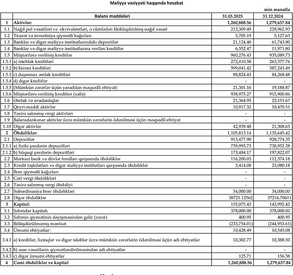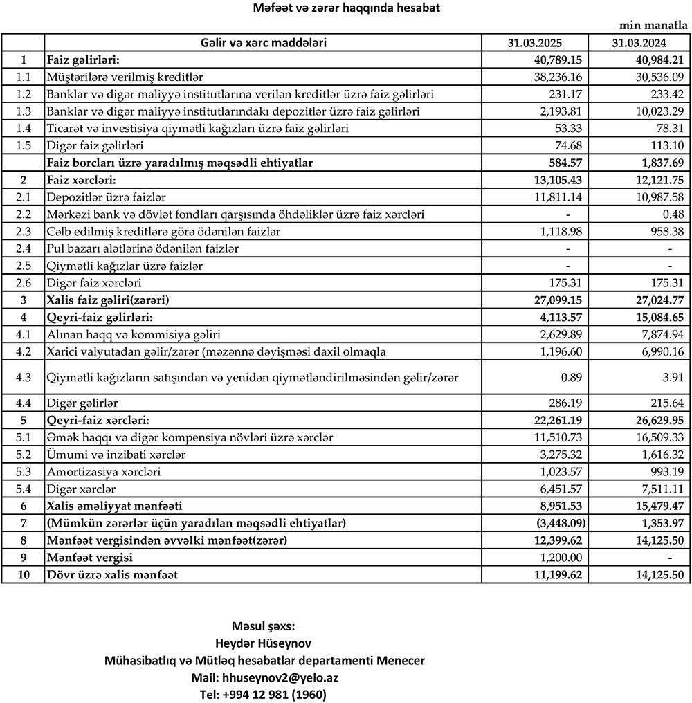 Beləliklə, “Yelo Bank”ən xalis mənfəəti 2025-ci ilin 1-ci rübündə ötən ilin eyni dövrü ilə müqayisədə 2 milyon 925 min manat və ya 20,7% azalıb.