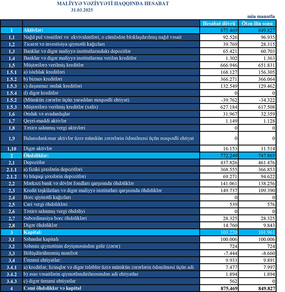 Ötən ilin sonu ilə müqayisədə 2025-ci ilin ilk rübündə "Turanbank"ın cəmi aktivləri 25 milyon 642 min manat və ya 3% artaraq 31 mart 2025-ci il tarixində 875 milyon 469 min manata, o cümlədən kredit portfeli (müştərilərə verilmiş kreditlər) 15 milyon 115 min manat və ya 2,3% artaraq 666 milyon 946 min manata çatıb. "Turanbank"ın istehlak kreditləri portfeli 11 milyon 822 min manat artaraq 168 milyon 127 min manata, biznes kreditləri portfeli 207 min manat artaraq 366 milyon 271 min manata, ipoteka kreditləri portfeli 3 milyon 87 min manat artaraq 132 milyon 549 min manata yüksəlib.