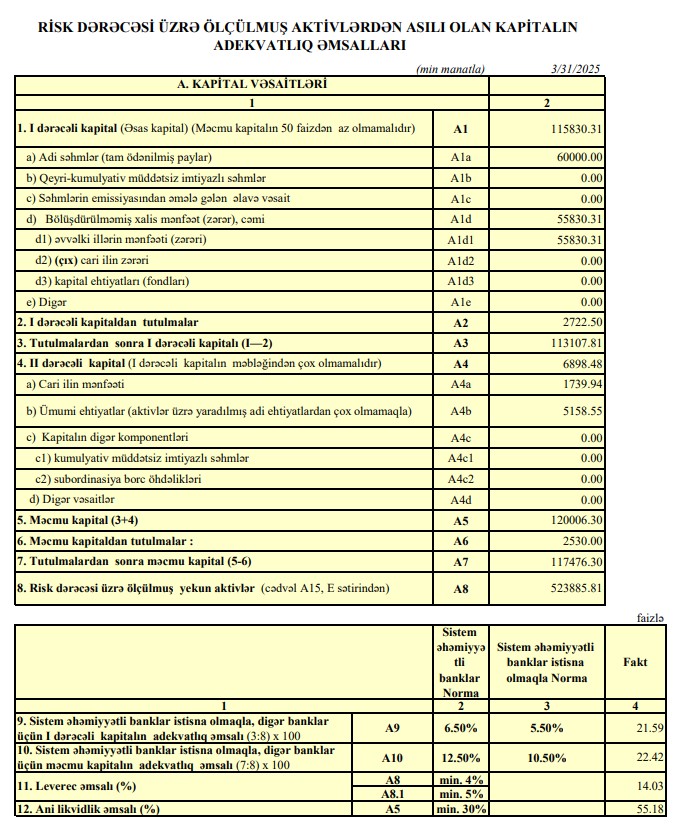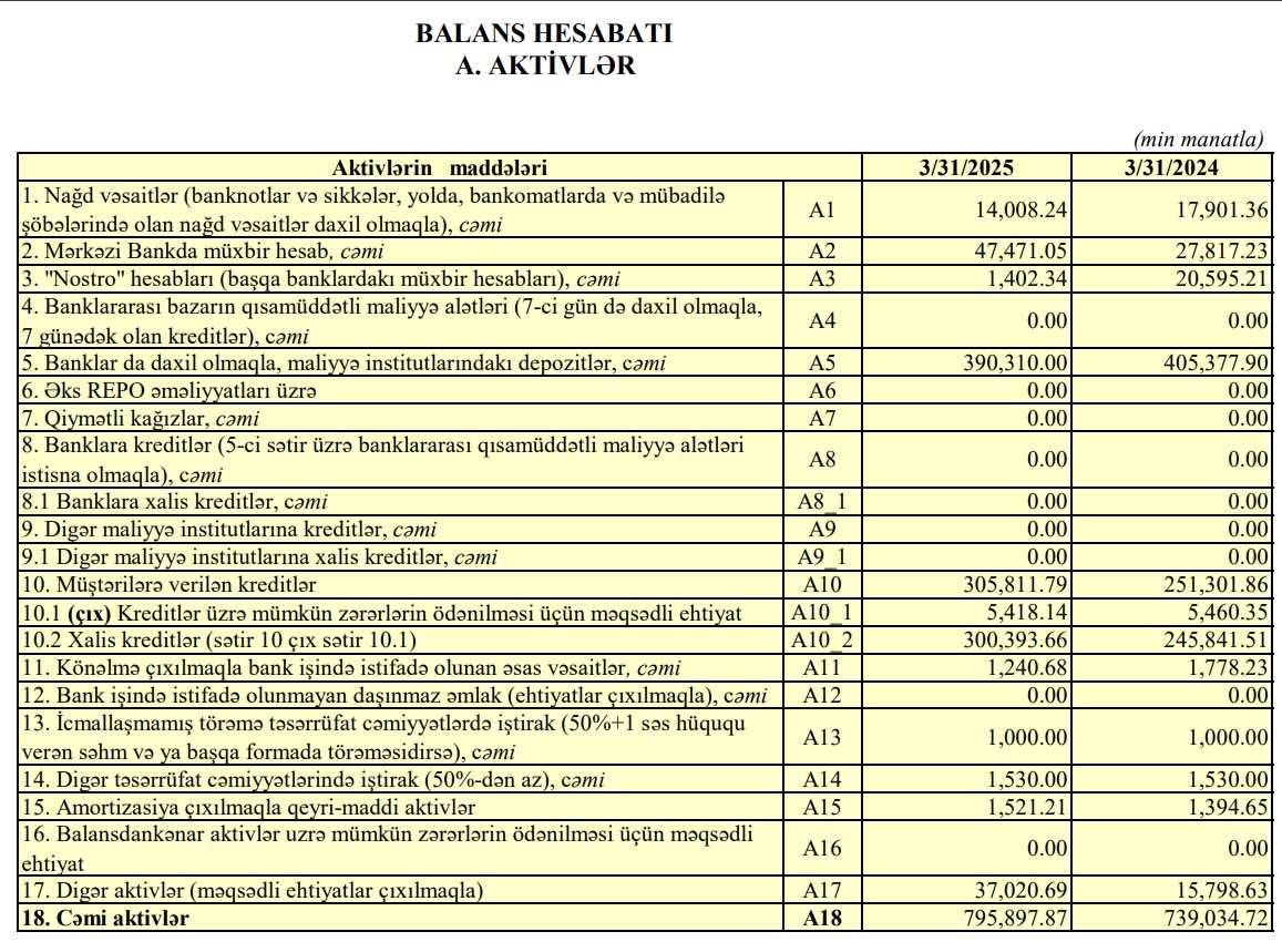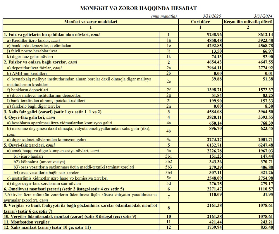 Beləliklə, ASB-nin xalis mənfəəti 2025-ci ilin ilk rübündə ötən ilin eyni dövrü ilə müqayisədə 905 min manat və ya 2,1 dəfə artıb.