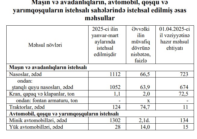 Yük avtomobillərinin istehsalı isə 86% azalaraq 28 ədədə düşüb. 01.04.2025-ci il vəziyyətinə hazır məhsul ehtiyatı 15 ədəd olub.