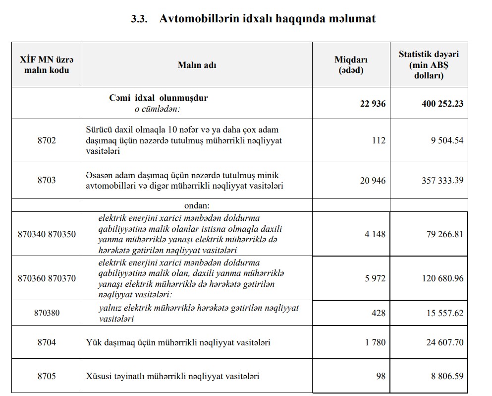 2025-ci ilin 1-ci rübündə (yanvar-mart) Azərbaycana 400 milyon 252 min dollar dəyərində 22 min 936 ədəd nəqliyyat vasitəsi, o cümlədən 357 milyon 333 milyon dollar dəyərində 20 min 946 ədəd minik avtomobili idxal olunub.