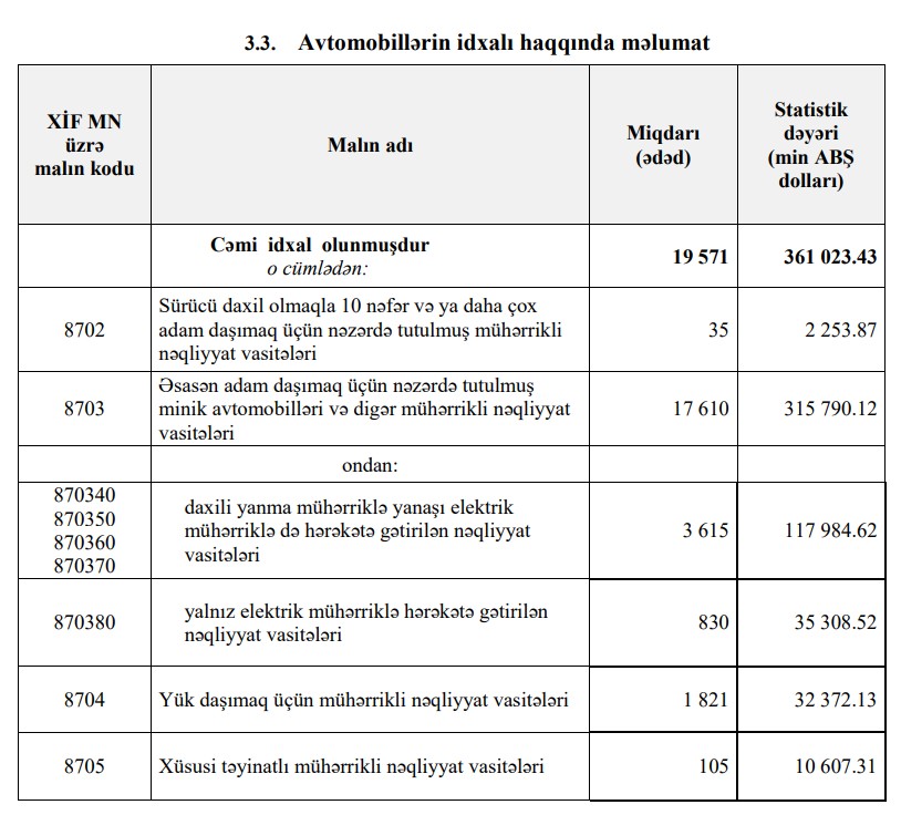 Müqayisə üçün qeyd edək ki, 2024-cü ilin 1-ci rübündə Azərbaycana 361 milyon 23 min dollar dəyərində 19 min 571 ədəd nəqliyyat vasitəsi, o cümlədən 315 milyon 790 milyon dollar dəyərində 17 min 610 ədəd minik avtomobili idxal olunmuşdu.