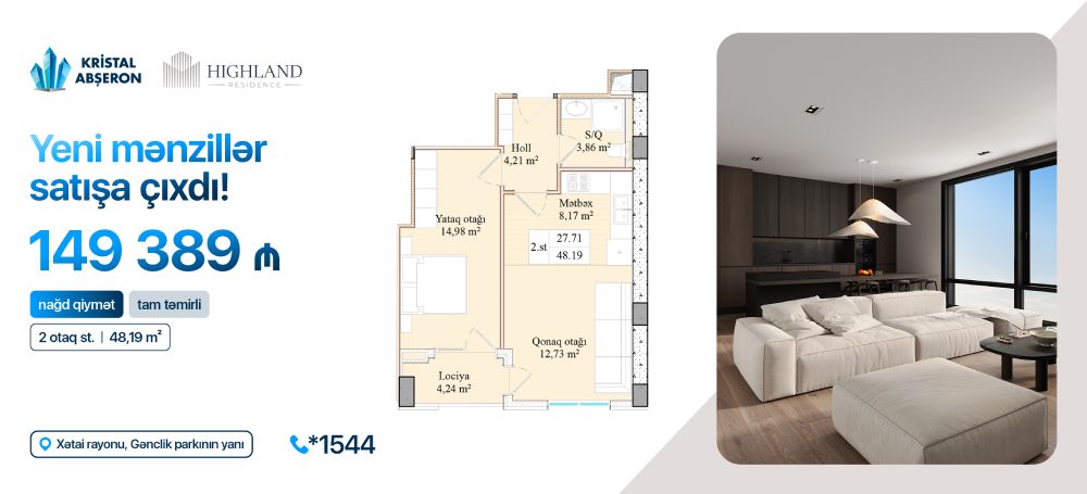 "Highland Residence"də yeni mənzil satışları başladı - faizsiz kreditlə 2 otaqlı mənzillər!(®) Mənzil sahibi olmaq istəyənlər üçün gözlənilən fürsət! "Highland Residence"də 2 otaq studiya, tam təmirli yeni mənzillər satışa çıxdı! Həm də faizsiz, daxili kreditlə!