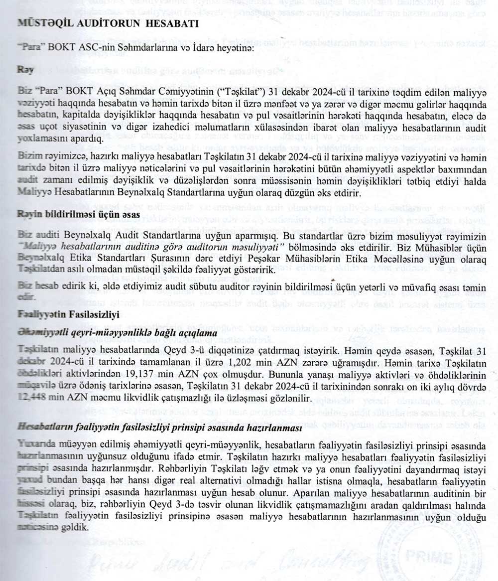 “Para BOKT” ASC 2024-cü il üzrə maliyyə göstəricilərini açıqlayıb.