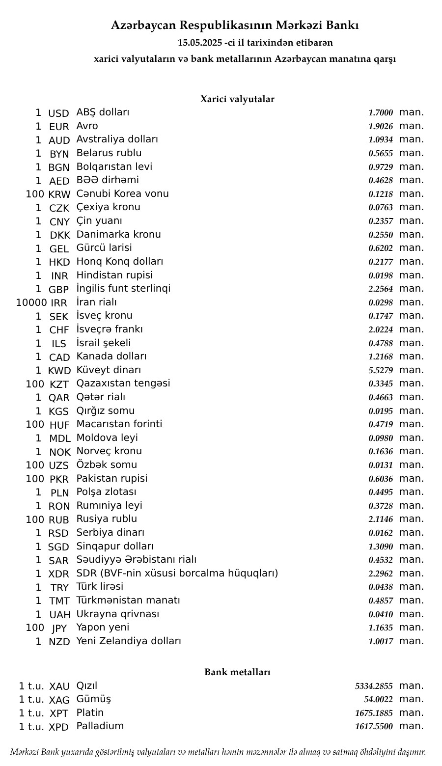Rəsmi məzənnələr açıqlandı