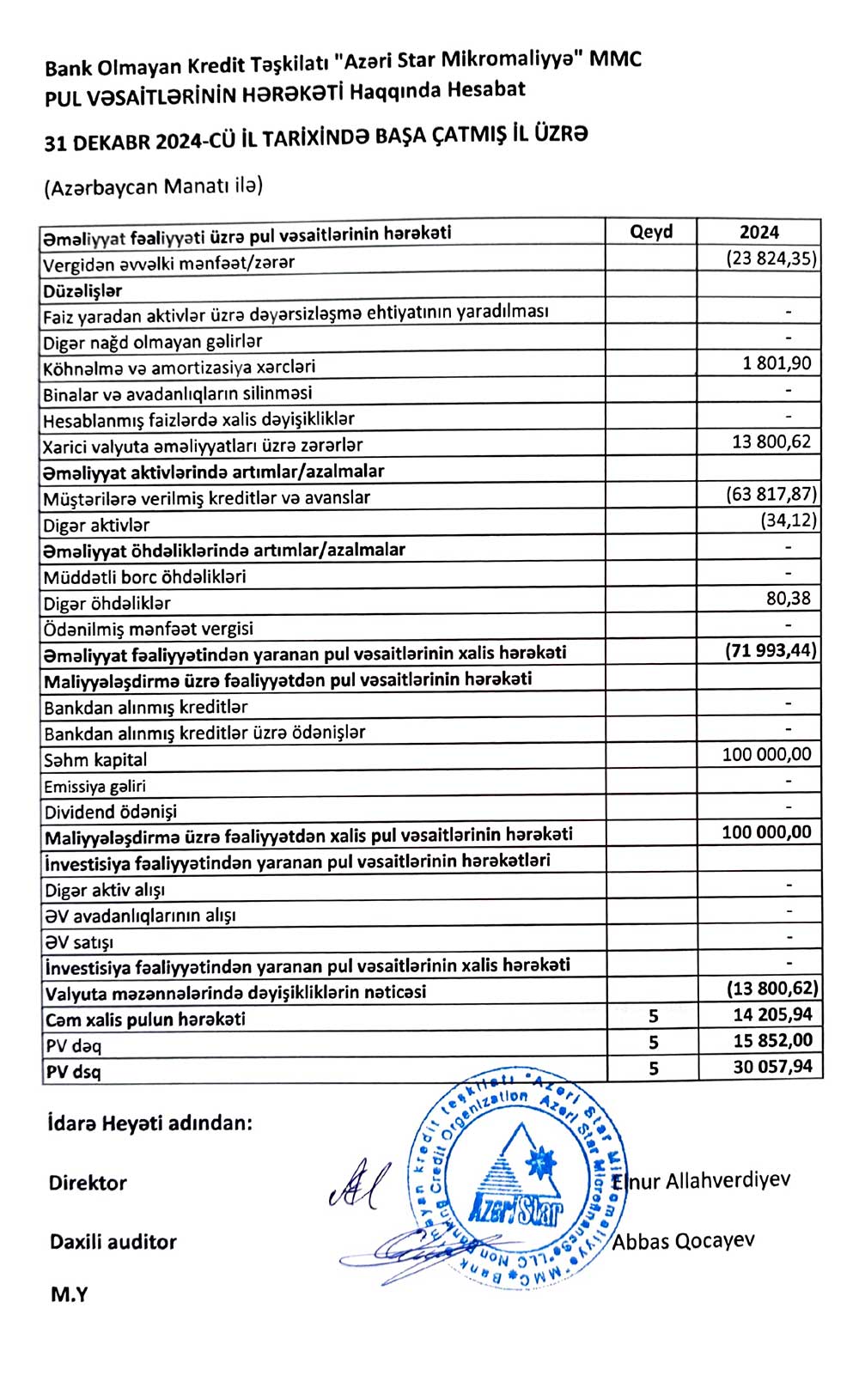 Bank Olmayan Kredit Təşkilatı "Azəri-Star Mikromaliyyə" MMC-nin 31 dekbr 2024-cü il tarixində başa çatmış il üzrə maliyyə hesabatları - ƏTRAFLI