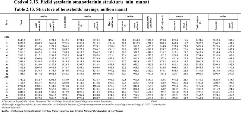 İyulda əmanətlər 6 milyard 907.1 milyon manatdan 6 milyar 860.7 milyon manata (46,4 milyon manat azalma), o cümlədən xarici valyutada olan əmanətlər 5 milyard 68.7 milyon manatdan 5 milayrd 38.7 milyon manata (30 milyon manat azalma), milli valyutada olan əmanətlər isə 1 milyard 838.4 milyon manatdan 1 milyard 822 milyon manata düşüb (16,4 milyon manat azalma).