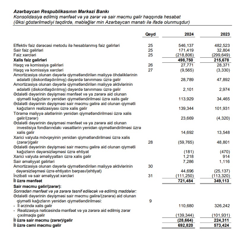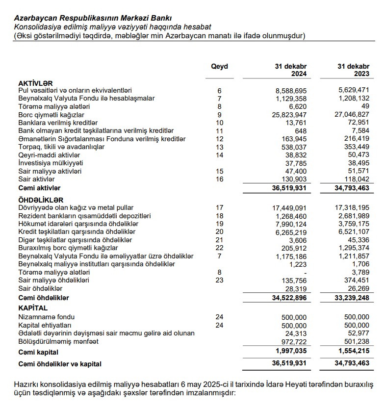 Bu barədə Marja.az Azərbaycan Respublikasının Mərkəzi Bankının 31 dekabr 2024-cü il tarixində bitmiş il üzrə Konsolidasiya Edilmiş Maliyyə Hesabatlarına istinadən xəbər verir.