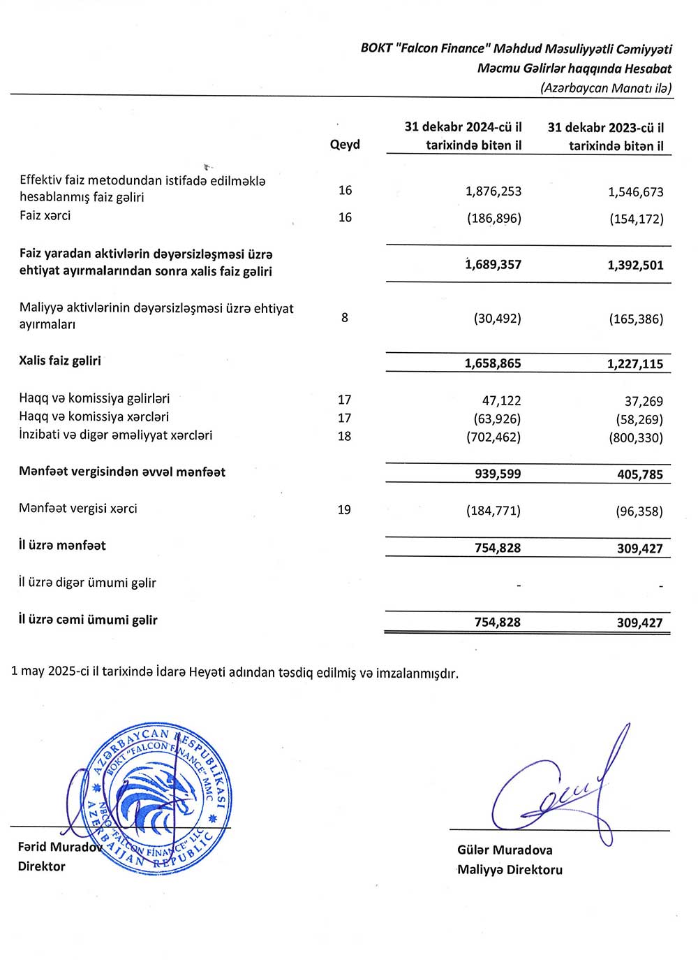 BOKT "Falcon Finance"ın 2024-cü il üzrə maliyyə hesabatları – XALİS MƏNFƏƏTİ 2,4 DƏFƏ ARTIB